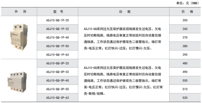 ASJ10-GQ系列自復(fù)式過欠壓保護器(以下簡稱ASJ),適用于單相交流電壓230V或三相電壓400V,頻率50Hz,額定工作電流至63A及以下的用戶或負載。由中性線故障引起的單相或三相線路過、欠電壓時,保護器對用電設(shè)備進行保護。