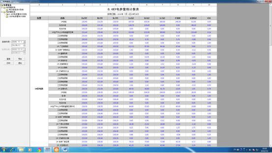 參數(shù)報表反映了本項目監(jiān)測回路的在過去某時間點的運行數(shù)據(jù),通過當前或者過去某時間點的實時參量數(shù)據(jù)反映回路狀態(tài)。主要的數(shù)據(jù)包括:三相電壓,三相電流,電能,有功功率,無功功率,功率補償因數(shù),頻率。界面如圖4所示