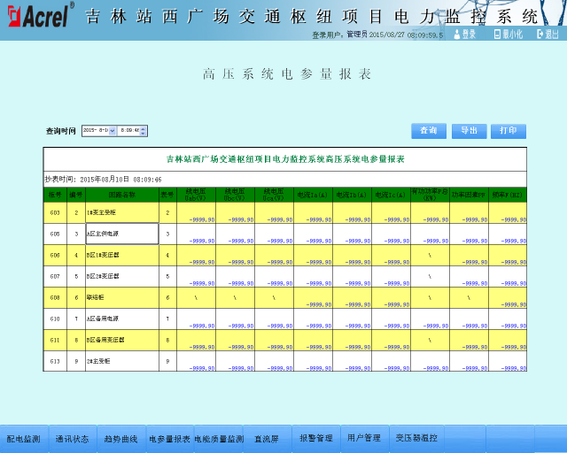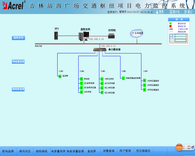 本項(xiàng)目的電力監(jiān)控系統(tǒng),可以實(shí)現(xiàn)對(duì)站內(nèi)高、配電回路的實(shí)時(shí)監(jiān)控,有利于電能管理。另一方面,電力監(jiān)控系統(tǒng)不僅能夠準(zhǔn)確的表示出回路的用電狀況,它還具備網(wǎng)絡(luò)通訊等功能,能夠與計(jì)算機(jī)、串口服務(wù)器等設(shè)備進(jìn)行組合,及時(shí)的顯示站內(nèi)各個(gè)配電回路的運(yùn)作狀態(tài),當(dāng)站內(nèi)電力系統(tǒng)的負(fù)載越標(biāo)時(shí),電力監(jiān)控系統(tǒng)能夠迅速報(bào)警,發(fā)出語音提示。另外,電力監(jiān)控系統(tǒng)還能夠生成報(bào)表、曲線圖等統(tǒng)計(jì)信息,便于有關(guān)人員分析站內(nèi)各部分的用電狀況,使站內(nèi)的用電活動(dòng)更加安全,從而保證站內(nèi)人員的生命安全,提高車站工作人員的工作效率。
