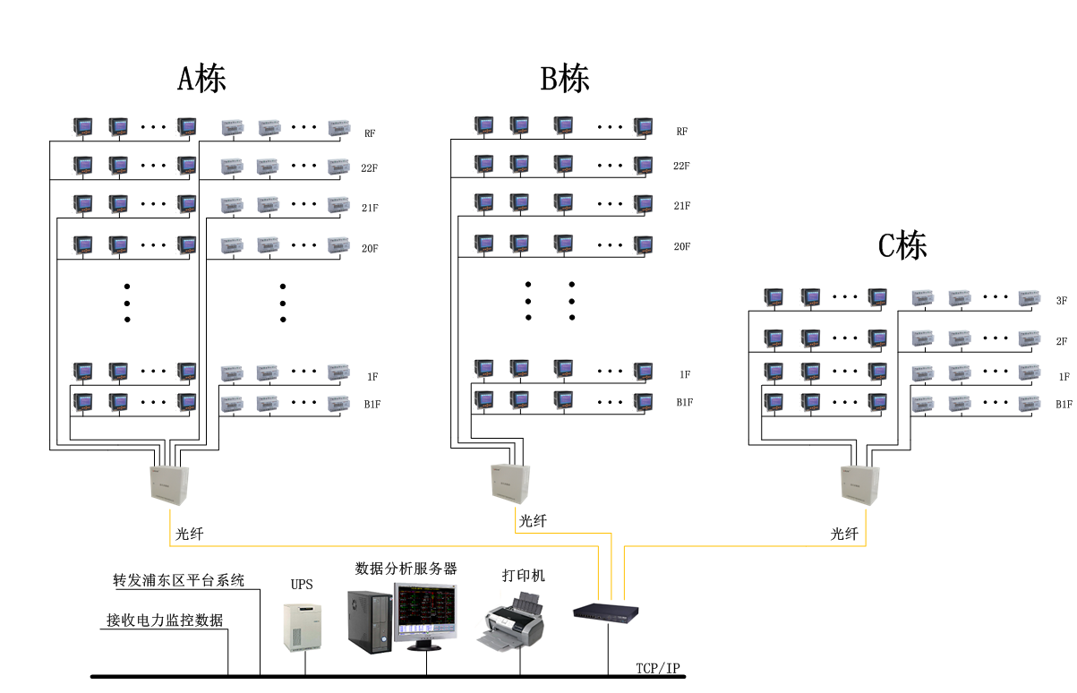 該系統(tǒng)主要采用分層分布式計(jì)算機(jī)網(wǎng)絡(luò)結(jié)構(gòu),如系統(tǒng)結(jié)構(gòu)圖所示:站控管理層、網(wǎng)絡(luò)通訊層和現(xiàn)場設(shè)備層。其中大唐盛世商務(wù)中心項(xiàng)目現(xiàn)場設(shè)備分布如下A棟進(jìn)線ACR系列多功能儀表117臺,出線DTSF系列計(jì)量儀表125臺;B棟進(jìn)線ACR系列多功能儀表91臺,出線DTSF系列計(jì)量儀表12臺;C棟進(jìn)線ACR系列多功能儀表19臺,出線DTSF系列計(jì)量儀表16臺;