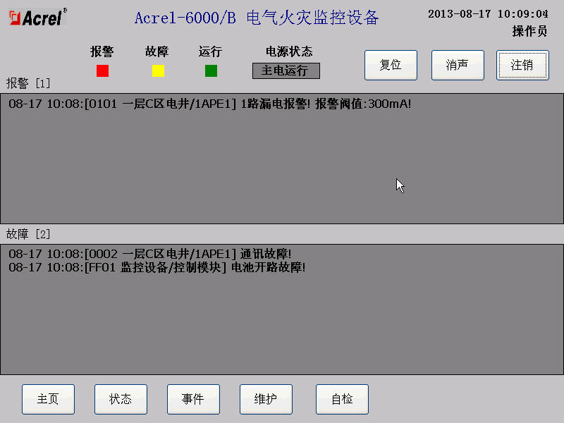本套上位機(jī)軟件Acrel-6000電氣火災(zāi)系統(tǒng)。主要有以下功能特點(diǎn):友好的人機(jī)界面,可實(shí)時(shí)和定時(shí)采集現(xiàn)場(chǎng)設(shè)備的剩余電流數(shù)據(jù),并有報(bào)警提示聲光報(bào)警等功能??蛻艨筛鶕?jù)實(shí)際需要對(duì)漏電流報(bào)警值進(jìn)行設(shè)置,報(bào)警故障解除時(shí),可遠(yuǎn)方進(jìn)行復(fù)位。系統(tǒng)可對(duì)報(bào)警事件、日期、報(bào)警值、越線值進(jìn)行記錄,并生成報(bào)表,可對(duì)報(bào)警事件記錄進(jìn)行打印。