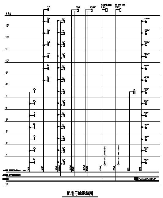 本項(xiàng)目針對(duì)龍港新港花園寫(xiě)字樓,該樓共13層。在每個(gè)樓層的強(qiáng)電間內(nèi)均設(shè)有照明配電箱和應(yīng)急照明配電箱,另外在頂部機(jī)房層設(shè)有電梯配電箱和空調(diào)室外機(jī)配電箱,如以上“配電干線系統(tǒng)圖”所示。