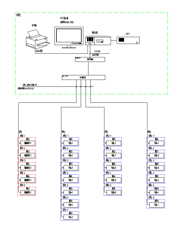 系統(tǒng)通訊結(jié)構(gòu)示意圖,主要顯示系統(tǒng)的組網(wǎng)結(jié)構(gòu),系統(tǒng)采用分層分布式結(jié)構(gòu),同時(shí)監(jiān)測(cè)間隔層設(shè)備的通信狀態(tài)。紅色表示通訊正常,綠色表示通訊故障。見圖(4)。