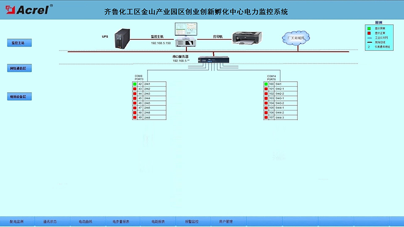 本項(xiàng)目共5臺(tái)AM5系列微機(jī)保護(hù)裝置、45臺(tái)ACR系列多功能電力儀表。在配電室內(nèi)放置采集裝置,現(xiàn)場(chǎng)多功能儀表經(jīng)485總線連接至對(duì)應(yīng)的采集裝置,現(xiàn)場(chǎng)串口服務(wù)器經(jīng)網(wǎng)線將數(shù)據(jù)傳輸至監(jiān)控主機(jī)上。