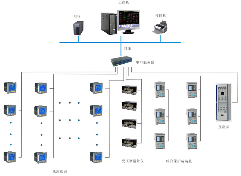 本項(xiàng)目共1個(gè)10KV變電站,變電站搭建一套電力監(jiān)控系統(tǒng),放置在35KV變電站值班室內(nèi),變電所內(nèi)部綜保、多功能儀表、溫控儀等設(shè)備通過(guò)485接口接入變電站內(nèi)部采集器,再通過(guò)采集器傳輸至電力監(jiān)控主機(jī),實(shí)現(xiàn)數(shù)據(jù)在電腦上可視化管理。