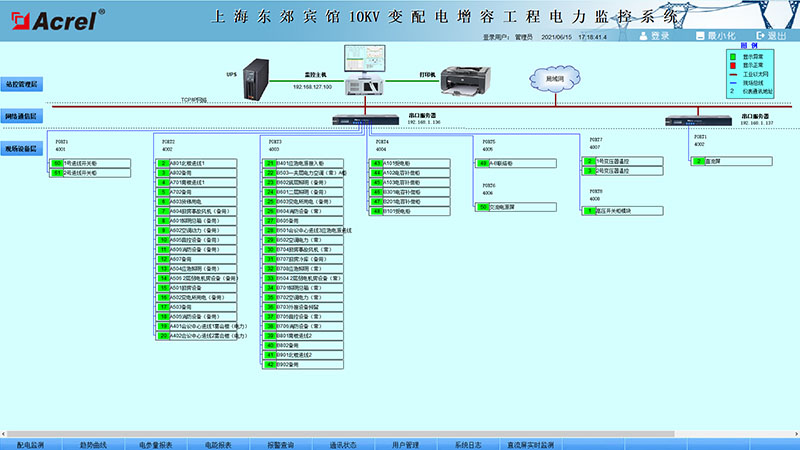 安科瑞Acrel-2000電力監(jiān)控系統(tǒng)支持實(shí)時(shí)監(jiān)視接入系統(tǒng)的各設(shè)備的通訊狀態(tài),能夠完整的顯示整個(gè)系統(tǒng)網(wǎng)絡(luò)結(jié)構(gòu);可在線診斷設(shè)備通訊狀態(tài),發(fā)生網(wǎng)絡(luò)異常時(shí)能自動(dòng)在界面上顯示故障設(shè)備或元件及其故障部位。從而方便運(yùn)行維護(hù)人員實(shí)時(shí)掌握現(xiàn)場(chǎng)各設(shè)備的通訊狀態(tài),及時(shí)維護(hù)出現(xiàn)異常的設(shè)備,保證系統(tǒng)的穩(wěn)定運(yùn)行。