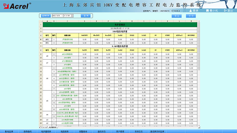 主要功能:查詢(xún)各回路或者設(shè)備指定時(shí)間的運(yùn)行參數(shù),報(bào)表中顯示電參量信息應(yīng)包括:各相電流、三相電壓、總功率因數(shù)、總有功功率、總無(wú)功功率、正向有功電能等。電參量報(bào)表也支持導(dǎo)出Excel格式文件,還可以根據(jù)用戶(hù)要求導(dǎo)出PDF格式文件。