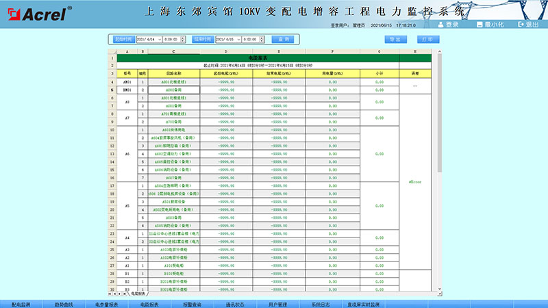 主要功能:具有起始時(shí)間和結(jié)束時(shí)間的時(shí)間選擇框,選定想要查詢(xún)的時(shí)間段后,通過(guò)點(diǎn)擊查詢(xún)按鈕可查詢(xún)出系統(tǒng)項(xiàng)目范圍內(nèi)所有配電回路的用電量。可通過(guò)導(dǎo)出按鈕將報(bào)表以Excel形式導(dǎo)出保存,通過(guò)打印按鈕進(jìn)行報(bào)表打印。
