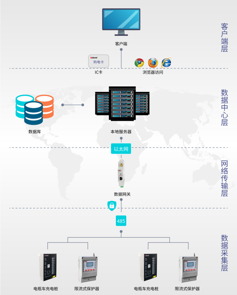 ??各級政府部門高度重視電瓶車充電引發(fā)火災(zāi)的危害,GB51348-2019《民用建筑電氣設(shè)計標(biāo)準(zhǔn)》中也規(guī)定了儲備倉庫、電動車充電等場所的末端回路應(yīng)設(shè)置限流式電氣防火保護(hù)器。AcrelCloud-9500電瓶車充電樁收費平臺將現(xiàn)場的離散電瓶車充電樁接入平臺,進(jìn)行集中管理,降低管理難度,方便用戶運維,同時通過充電樁本身的安全監(jiān)控與保護(hù),結(jié)合限流式保護(hù)器,能夠及時的杜絕充電過程中存在的火災(zāi)隱患,讓充電安全、放心,能夠切實保障人民群眾的生命財產(chǎn)安全。