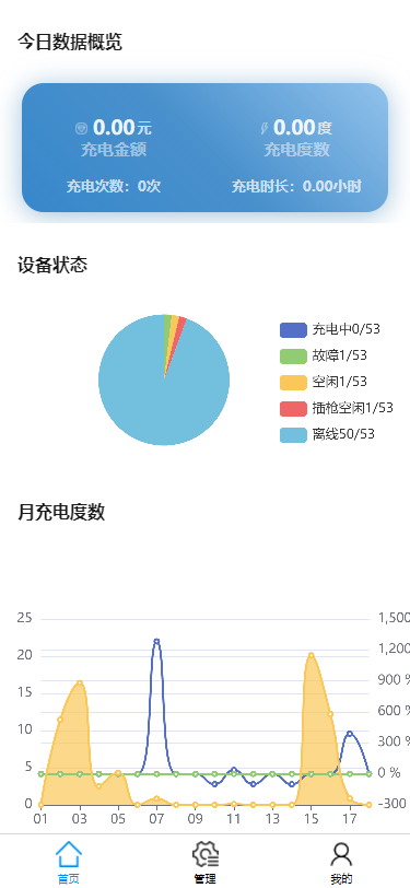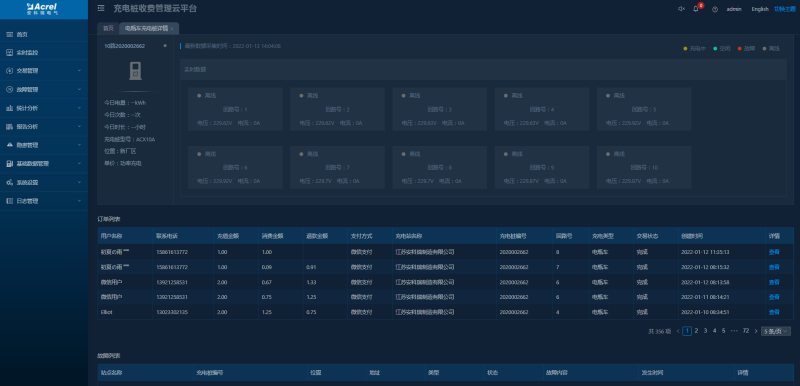 ??顯示充電樁各回路的狀態(tài)及充電數(shù)據(jù),統(tǒng)計充電樁今日充電數(shù)據(jù)、訂單記錄、故障信息,可以查看訂單和故障的詳情。