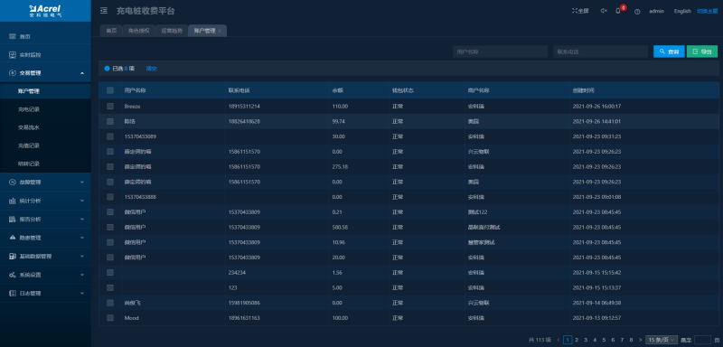 ??顯示所有關(guān)聯(lián)充電用戶的賬戶信息,可進(jìn)行充值、退款、凍結(jié)、解凍、注銷等操作。