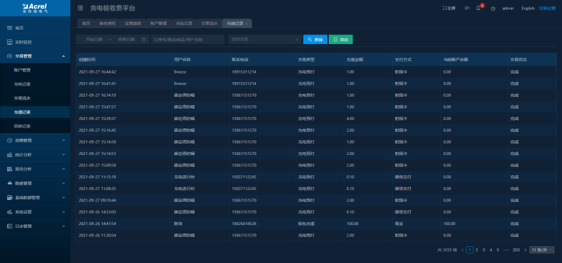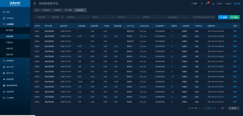 ??顯示所有訂單數(shù)據(jù),可以對訂單按照充電站、充電樁、支付方式、交易狀態(tài)等進(jìn)行分類查詢,可對充電中的充電樁進(jìn)行停止充電操作。