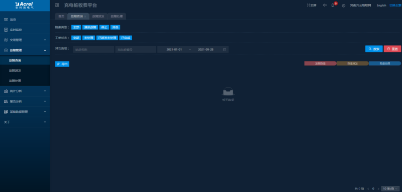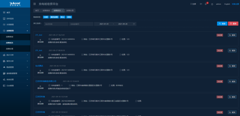 ??顯示充電樁的故障信息及處理進(jìn)度,故障類型包括過壓、欠壓、空載、絕緣檢測故障、漏電、過溫、短路等。