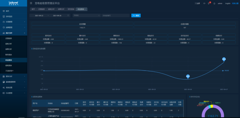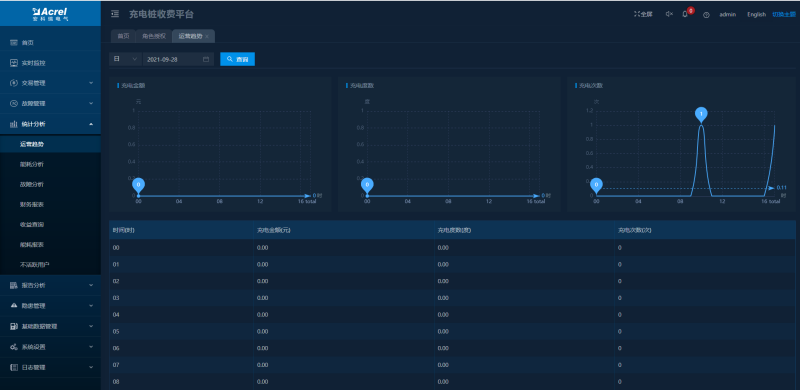 ??顯示充電站地理位置、站點信息及充電設(shè)備狀態(tài),包括充電中、空閑、故障、離線等。統(tǒng)計充電站運營數(shù)據(jù)和充電數(shù)據(jù),包括充電金額、充電度數(shù)、充電次數(shù)、充電時長,并進(jìn)行今日、昨日、本月趨勢分析和對比。