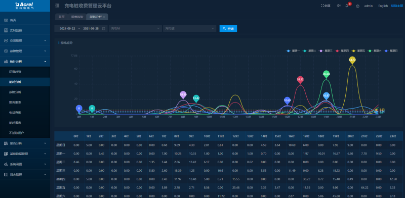 ??可查看指定時段充電站和充電樁的用電量,顯示對應(yīng)的能耗趨勢圖并進(jìn)行同環(huán)比分析。