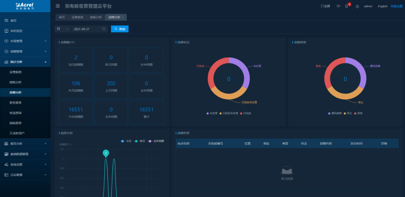 ??可查看相關(guān)時間內(nèi)的故障數(shù)、故障狀態(tài)、故障類型、趨勢分析及故障列表。
