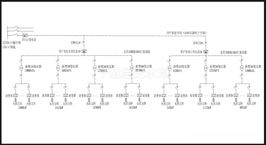 本項目通過2個并網(wǎng)點上網(wǎng),2個并網(wǎng)點的裝機容量分別為5.99MW、2.535MW(交流側(cè))由7個光伏發(fā)電單元構(gòu)成。該項目運營模式為全額上網(wǎng)。利用廠房屋頂建設(shè)光伏發(fā)電系統(tǒng),關(guān)鍵設(shè)備光伏組件、逆變器、變壓器等采用國內(nèi)知名產(chǎn)品。本項目光伏發(fā)電系統(tǒng)所輸出的直流電經(jīng)組串式逆變器轉(zhuǎn)換成交流電后,就地升壓至10KV,經(jīng)開關(guān)柜通過1回出線接入至廠區(qū)10KV進線母線的用戶側(cè),實現(xiàn)并網(wǎng)。變電站近三年至小負荷平均-0.15MW,考慮主變 N-1 情況下,另一主變負載不超過80%,則該變電站可接入的分布式光伏容量為 179.81MW,目前該變電站已接入及在途分布式光伏容量共 127.1W,因此剩余可接入容量 52.71MW。滿足本期接入需求。光伏監(jiān)控系統(tǒng)按站控層、就地層、架構(gòu),通過通信管理機或協(xié)議轉(zhuǎn)換器對光伏發(fā)電系統(tǒng)設(shè)備層的各種設(shè)備(逆變器、防孤島保護、故障解列裝置、電能質(zhì)量監(jiān)測裝置、直流屏等設(shè)備)信息進行采集和處理,將處理好的數(shù)據(jù)上傳至SCADA系統(tǒng)和遠動裝置。遠動裝置數(shù)據(jù)經(jīng)縱向加密后通過4G/5G無線通信網(wǎng)將上傳至荊門供電公司配調(diào)。