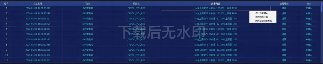 實時事件告警列表包括序號、發(fā)生時間、告警內(nèi)容、告警等級、確認狀態(tài)等分列展示,告警信息默認按照發(fā)生時間降序排列顯示,以不同的顏色區(qū)分已確認、未確認信號。