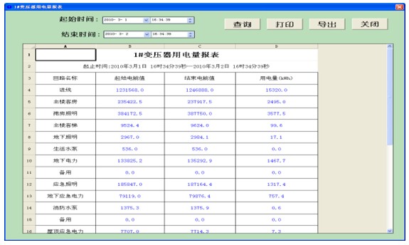此電能報表支持手動輸入時間查詢?nèi)魏螘r段和任何回路的耗電量。同一變壓器下的出線回路安排在同一個電能報表內(nèi),便于管理人員的統(tǒng)計管理。系類報表可設(shè)計成用戶慣用的電能報表格式,以延續(xù)工作人員的工作風格。
