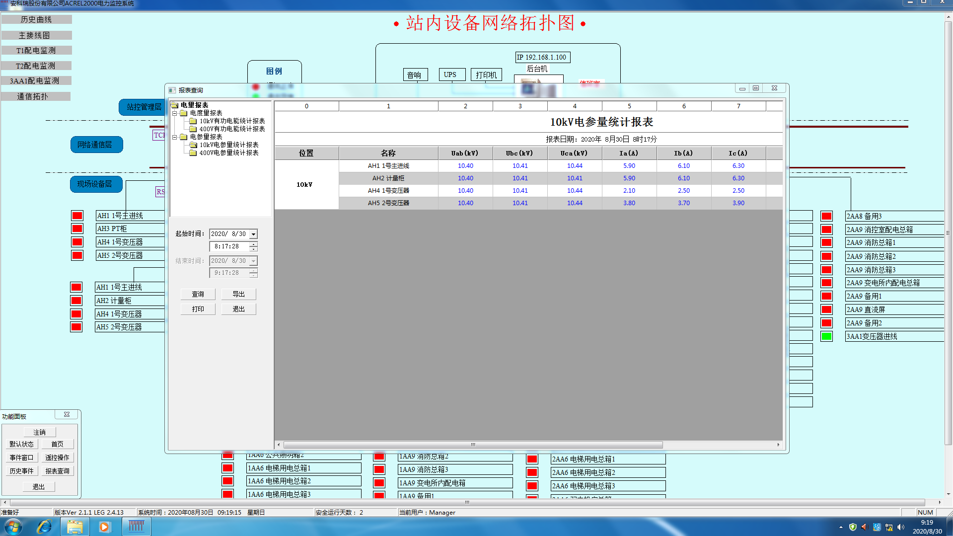 故障判斷與報(bào)警具有故障自動(dòng)判斷并采用彈框方式報(bào)警功能。報(bào)警類型包括開(kāi)關(guān)故障,電壓、電流超限,現(xiàn)場(chǎng)采集模塊通訊故障,與監(jiān)控系統(tǒng)通訊故障等。報(bào)警時(shí)間自動(dòng)記入系統(tǒng)數(shù)據(jù)庫(kù),方便用戶查詢,工作人員可隨時(shí)掌握變配電站實(shí)時(shí)運(yùn)行狀態(tài),發(fā)現(xiàn)變配電運(yùn)行故障并作出相應(yīng)處理,提高變配電的管理效率,提升電力系統(tǒng)安全性、可靠性。