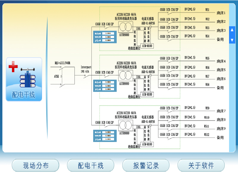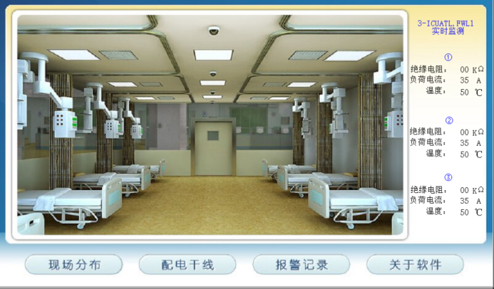 (1)系統(tǒng)柜可對(duì)安裝于各ICU病房、重癥監(jiān)護(hù)室的絕緣變壓器的運(yùn)行狀態(tài)進(jìn)行集中的、實(shí)時(shí)的監(jiān)測(cè)與顯示,監(jiān)測(cè)參量含對(duì)地絕緣電阻、變壓器負(fù)荷電流、變壓器繞組溫度等;系統(tǒng)具有一次圖及現(xiàn)場(chǎng)分布圖顯示功能,便于及時(shí)、直觀地發(fā)現(xiàn)IT供電系統(tǒng)的報(bào)警地點(diǎn)或區(qū)域;