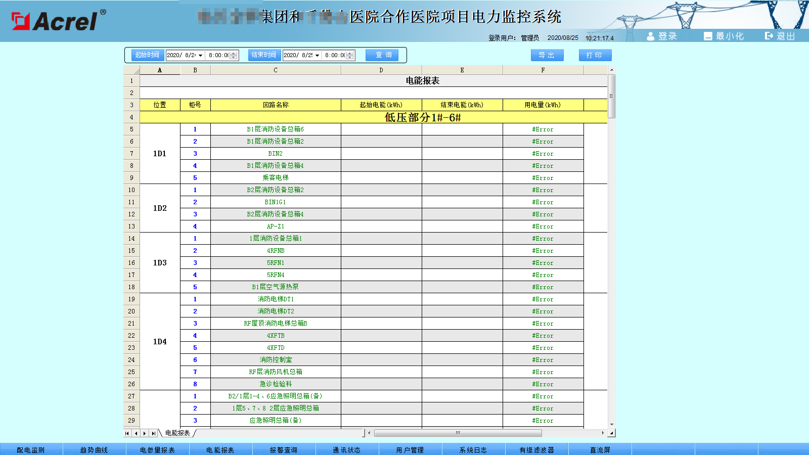電參數(shù)抄表 用電量報表功能,可選擇時間段進行查詢,支持任意時間段電度累計查詢,具備數(shù)據(jù)導出和報表打印等功能。為值班人員提供了準確可靠的電能報表。該報表各回路名稱和數(shù)據(jù)庫關聯(lián),方便用戶修改回路名稱。如下圖所示,顯示辦公樓實驗樓配電回路的準確用電量,用戶可以直接打印報表,可以以EXCEL格式另存到其他位置。 如下圖所示: