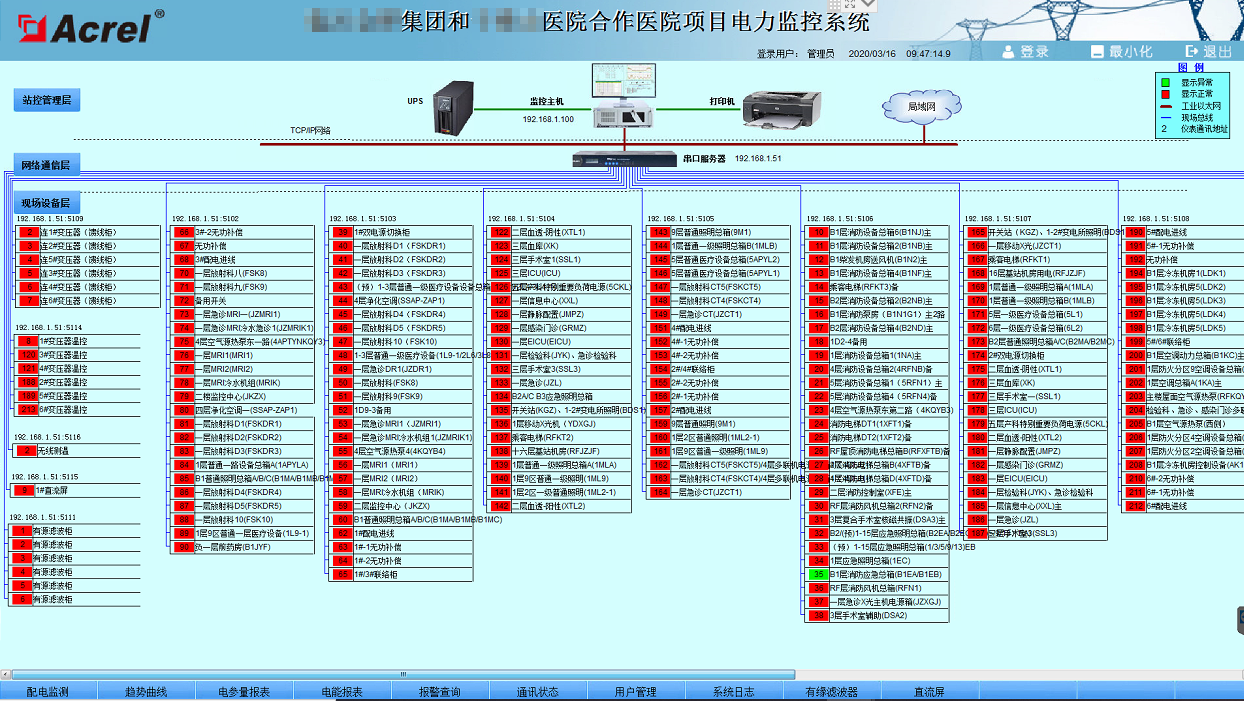 安科瑞Acrel-2000系統(tǒng)根據(jù)某集團與某醫(yī)院合作新建醫(yī)院項目的現(xiàn)場實際情況,整體網(wǎng)絡結構采用屏蔽雙絞線直接接至樓層的對應的數(shù)據(jù)采集器然后通過網(wǎng)線直接接至監(jiān)控主機,保障了電力監(jiān)控系統(tǒng)傳輸?shù)姆€(wěn)定性與實時性。如下圖所示:站控管理層、網(wǎng)絡通訊層和現(xiàn)場設備層。
