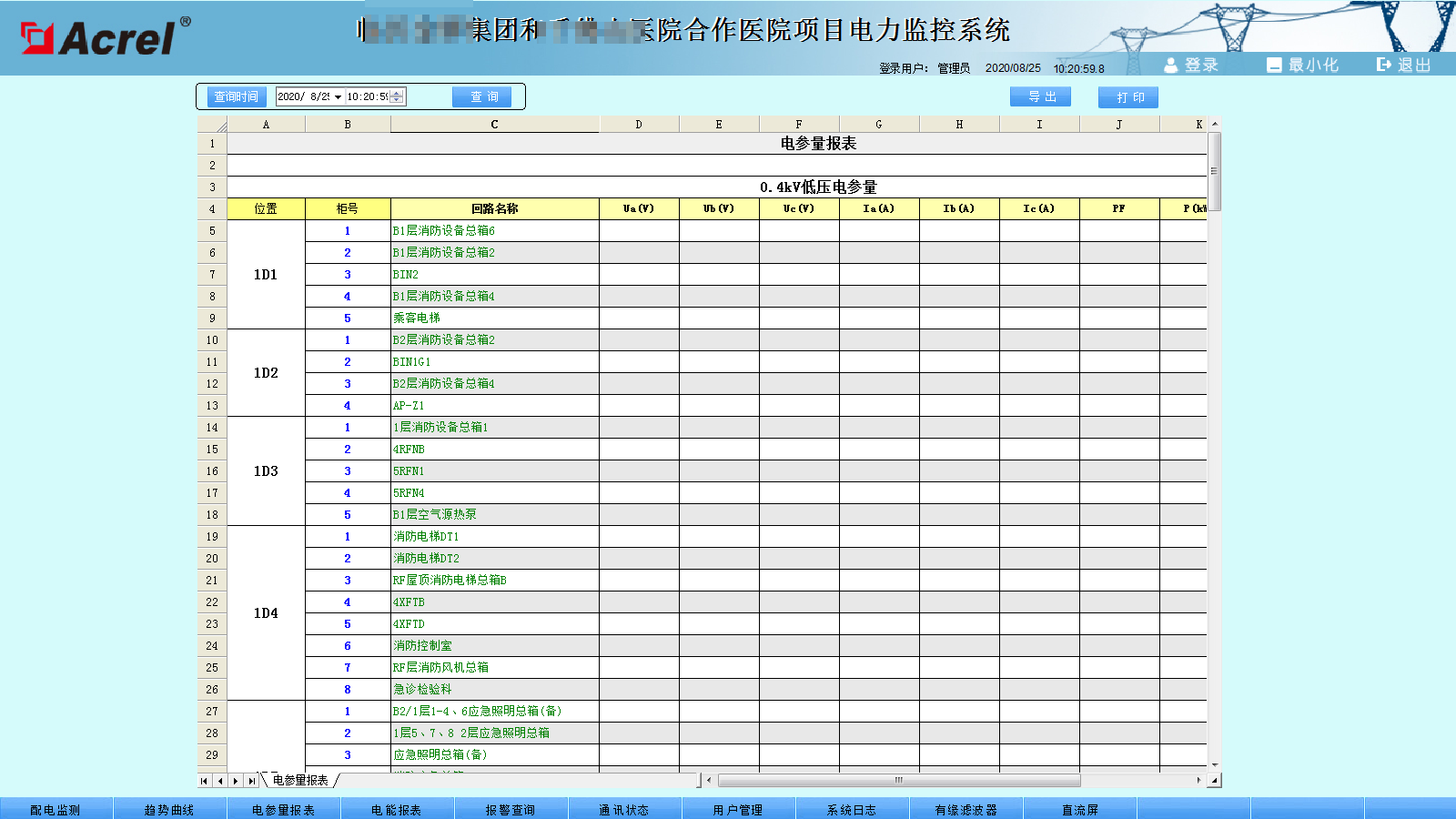 報警功能歷史查詢 事件告警記錄功能,主要完成對查詢時間段內出現(xiàn)的報警信息事件記錄以及發(fā)生時間,為值班人員提供依據(jù)并且分析事故發(fā)生的原因。 參數(shù)抄表功能,主要對低壓各出線回路的電參數(shù)進線查詢。支持任意時刻電參數(shù)查詢,具備數(shù)據(jù)導出和報表打印等功能。該報表查詢一科大廈樓層配電箱進出線各低壓回路的電參數(shù),主要包括:三相電流、有功功率和有功電度。該報表各回路名稱和數(shù)據(jù)庫關聯(lián),方便用戶修改回路名稱。如下圖所示:
