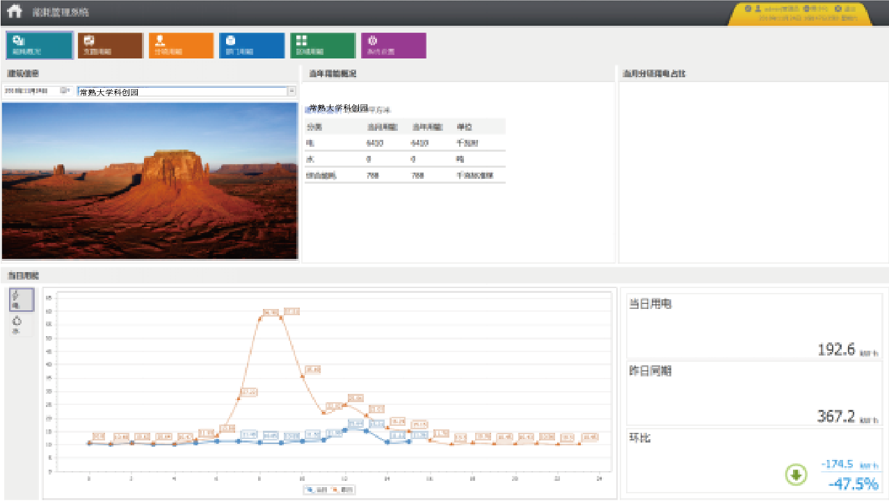 主頁(yè)面顯示該建筑的建筑圖片,建筑基本信息,建筑當(dāng)月分項(xiàng)用電餅圖和各種能源的消耗量。根據(jù)所選的建筑,對(duì)其建筑圖片進(jìn)行加載,可以選擇時(shí)間查看建筑能耗情況,選擇建筑或時(shí)間后自動(dòng)刷新,默認(rèn)為當(dāng)天。