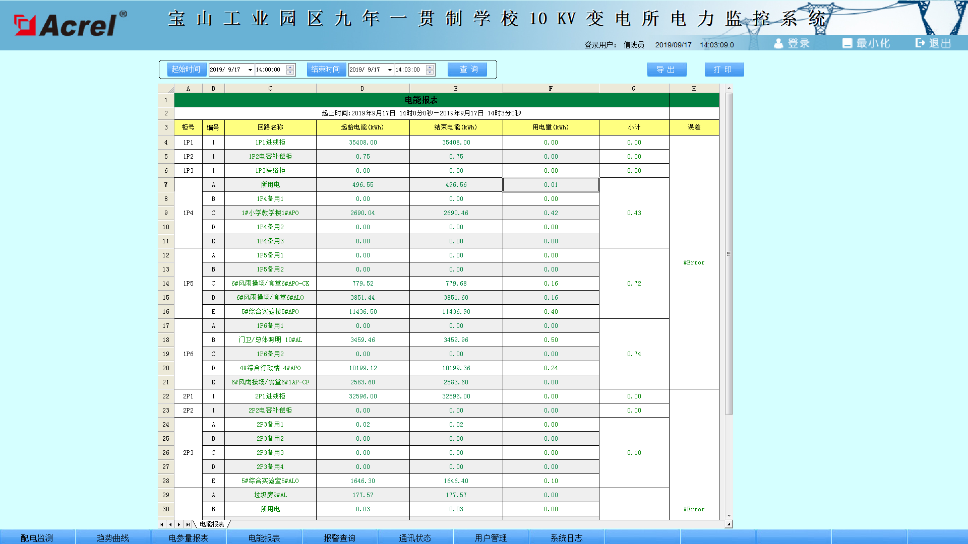 用電量報(bào)表功能,可選擇時(shí)間段進(jìn)行查詢,支持任意時(shí)間段電度累計(jì)查詢,具備數(shù)據(jù)導(dǎo)出和報(bào)表打印等功能。為值班人員提供了準(zhǔn)確可靠的電能報(bào)表。該報(bào)表各回路名稱和數(shù)據(jù)庫關(guān)聯(lián),方便用戶修改回路名稱。如下圖所示,用戶可以直接打印報(bào)表,可以以EXCEL格式另存到其他位置。 如下圖所示: