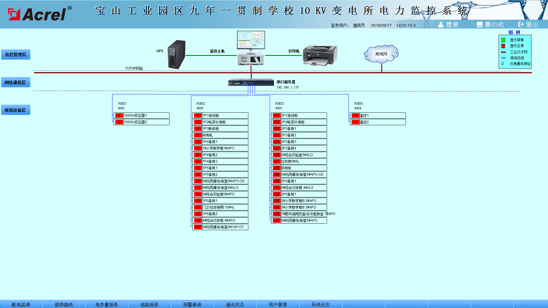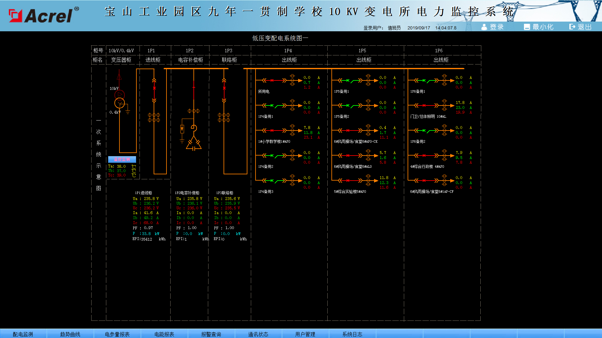 寶山工業(yè)園區(qū)九年一貫制學(xué)校為保證教學(xué)用電負(fù)荷的統(tǒng)計(jì)與分析及對危險(xiǎn)源實(shí)時(shí)監(jiān)控。需要對項(xiàng)目現(xiàn)場的配電箱內(nèi)進(jìn)線及出線回路進(jìn)行電壓(U)、電流(I)、功率(P)等參數(shù)進(jìn)行實(shí)時(shí)在線監(jiān)控。一旦監(jiān)控點(diǎn)被監(jiān)視參數(shù)異常,能夠及時(shí)檢測報(bào)警,有關(guān)人員采取必要的措施,避免安全事故的發(fā)生。自動抄表功能節(jié)省了人力物力,功率趨勢曲線功能能夠直觀的顯示各回路的工作狀態(tài)與時(shí)間,方便用戶找出非正常用電回路并且及時(shí)進(jìn)行整改,建立電能多級計(jì)量體系提供用能分析依據(jù)。