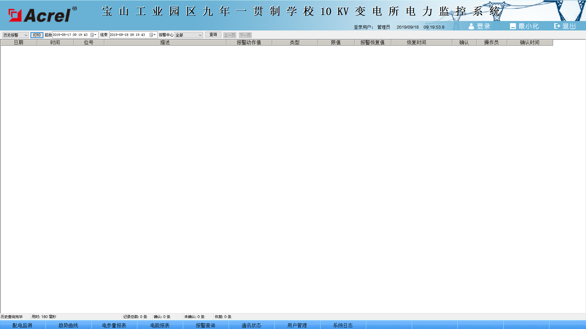 事件告警記錄功能,主要完成對查詢時(shí)間段內(nèi)出現(xiàn)的報(bào)警信息事件記錄以及發(fā)生時(shí)間,為值班人員提供依據(jù)并且分析事故發(fā)生的原因,如下圖所示: