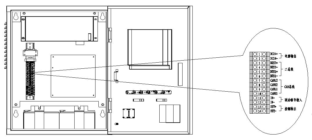 1)電氣火災(zāi)監(jiān)控系統(tǒng)接線端子置于主機(jī)柜內(nèi),有14個(gè)單排接線端子。