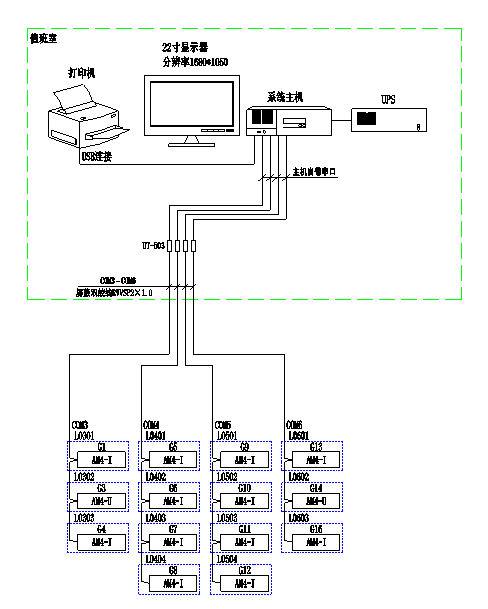現(xiàn)場中心配電室共計14臺AM4系列微機(jī)保護(hù)裝置,總共分為4條RS485總線接至監(jiān)控室的監(jiān)控主機(jī)的自帶串口上。