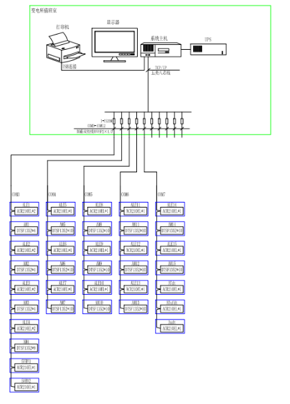 通訊示意圖為拓?fù)鋱D,顯示系統(tǒng)與儀表的通訊是否正常。通過界面模塊顏色的變化來反映整個系統(tǒng)各個監(jiān)控點(diǎn)位的運(yùn)行狀態(tài)。界面如圖所示。