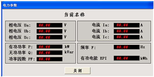 配電系統(tǒng)圖顯示整個(gè)配電系統(tǒng)的整體架構(gòu),便于管理人員快速了解配電系統(tǒng)的組織結(jié)構(gòu),參數(shù)界面實(shí)時(shí)顯示的電力參數(shù)數(shù)據(jù)可以反映配電系統(tǒng)的運(yùn)行狀態(tài)。配電系統(tǒng)界面如圖4所示,詳細(xì)參數(shù)如圖所示。