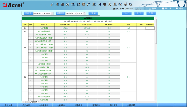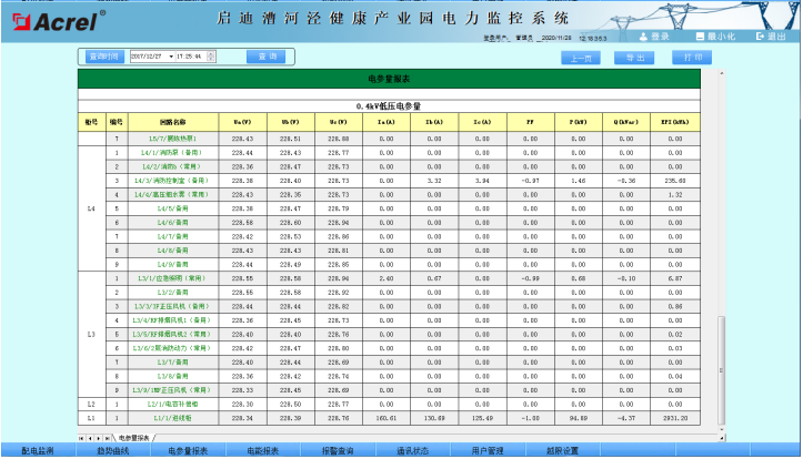 主要功能:查詢各回路或者設(shè)備時間的運行參數(shù),報表中顯示電參量信息應包括:各相電流、三相電壓、總功率因數(shù)、總有功功率、總無功功率、正向有功電能等。電參量報表也支持導出Excel格式文件,還可以根據(jù)用戶要求導出PDF格式文件。