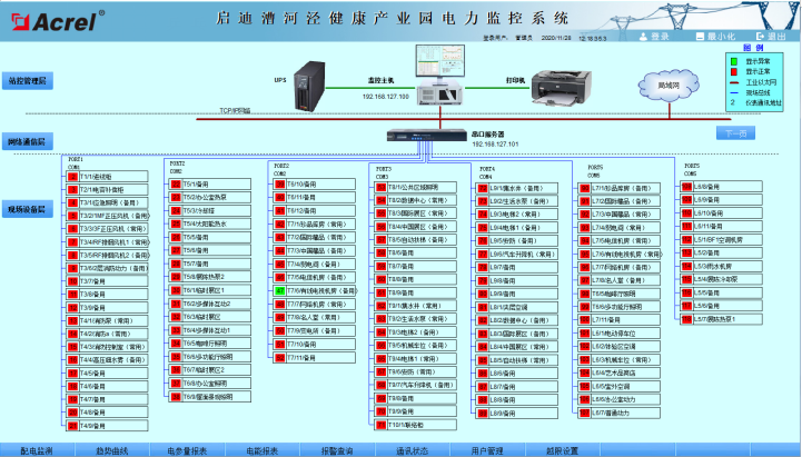 2.5 通訊狀態(tài) 安科瑞Acrel-2000電力監(jiān)控系統(tǒng)支持實時監(jiān)視接入系統(tǒng)的各設(shè)備的通訊狀態(tài),能夠完整的顯示整個系統(tǒng)網(wǎng)絡結(jié)構(gòu);可在線診斷設(shè)備通訊狀態(tài),發(fā)生網(wǎng)絡異常時能自動在界面上顯示故障設(shè)備或元件及其故障部位。從而方便運行維護人員實時掌握現(xiàn)場各設(shè)備的通訊狀態(tài),及時維護出現(xiàn)異常的設(shè)備,保證系統(tǒng)的穩(wěn)定運行。 主要功能:具備完整的系統(tǒng)通訊拓撲結(jié)構(gòu)圖,實時顯示設(shè)備通訊狀態(tài),紅色狀態(tài)表示對應設(shè)備通訊正常,綠色狀態(tài)表示設(shè)備通訊異常。系統(tǒng)主機和串口服務器/通訊管理機旁標明設(shè)備分配IP地址,各設(shè)備旁標識了設(shè)備地址和設(shè)備回路編號。