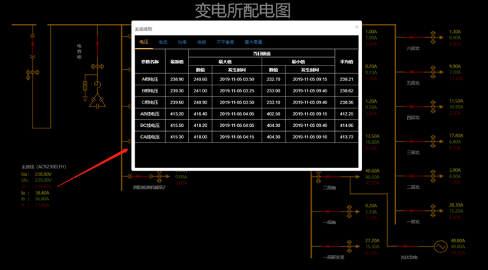 4.1 通過(guò)矢量配電圖監(jiān)測(cè)變電所用電情況,畫(huà)面響應(yīng)遙信變位、遙測(cè)越限報(bào)警,點(diǎn)擊某個(gè)配電回路后可以查詢(xún)?cè)撆潆娀芈返母黝?lèi)詳細(xì)用電參數(shù),包括實(shí)時(shí)值、大小值、平均值。