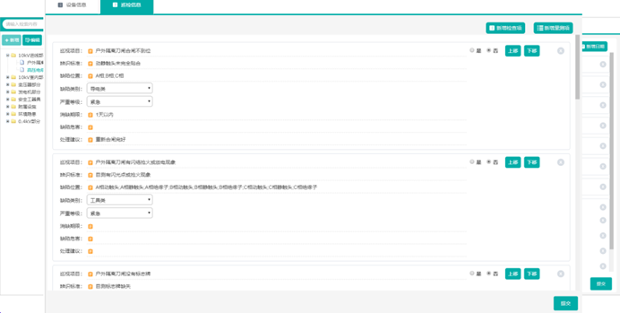 設(shè)備檔案 系統(tǒng)可配置每個(gè)變電所內(nèi)變壓器、進(jìn)線(xiàn)柜、出線(xiàn)柜、計(jì)量柜、高壓電纜等設(shè)備信息,記錄設(shè)備的廠(chǎng)家、型號(hào)、投運(yùn)日期等,并可靈活定義設(shè)備的巡檢項(xiàng)、缺陷類(lèi)別等信息。