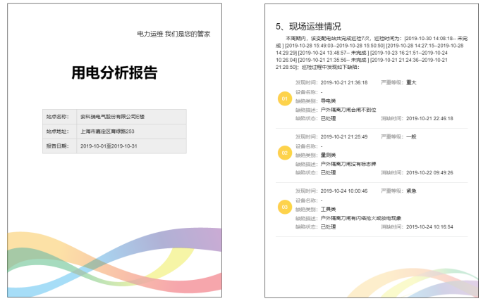 用戶(hù)報(bào)告 系統(tǒng)自動(dòng)匯總變電所一個(gè)月的運(yùn)行數(shù)據(jù),對(duì)變壓器負(fù)荷、配電回路用電量、功率因數(shù)、報(bào)警事件等進(jìn)行統(tǒng)計(jì)分析,并列出在該周期內(nèi)巡檢時(shí)發(fā)現(xiàn)的各類(lèi)缺陷及處理情況。