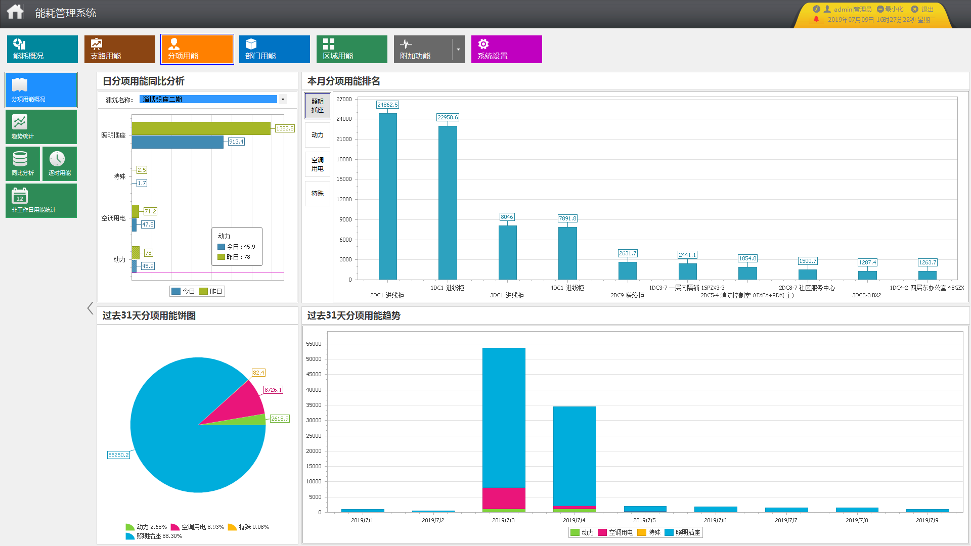 反映某分類能耗(例如電)當日及昨日同期、當月及上月同期、當年及上年同期的用能及對比,增長百分比及增加值; 反映某分類能耗過去48小時、過去31天、過去12個月、過去3年的用能趨勢; 反映某分項能耗的當月用能餅圖; 反映某分類能耗當年各月用能同比分析圖;