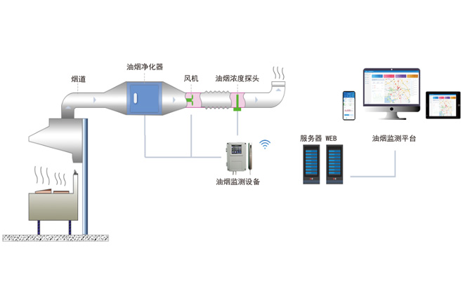對(duì)油煙排污數(shù)據(jù)的監(jiān)測(cè),包括油煙排放濃度,顆粒物,NmHc等數(shù)值采集監(jiān)測(cè);同時(shí)對(duì)監(jiān)控風(fēng)機(jī)和凈化器的啟停狀態(tài)、運(yùn)行數(shù)據(jù)進(jìn)行監(jiān)測(cè)。