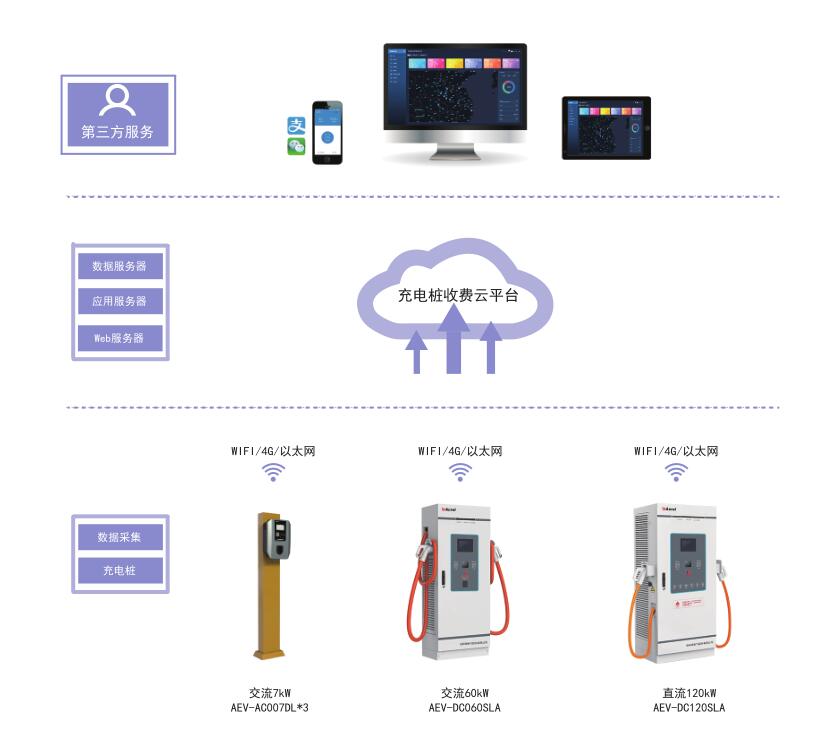 充電樁可選配WIFI/4G/以太網接入互聯(lián)網,配合加密技術和秘鑰分發(fā)技術,基于TCP/IP的數(shù)據(jù)交互協(xié)議,與云端進行直連。云平臺包含了充電收費和充電樁運營的所有功能,包括財務管理、變壓器監(jiān)控和運營分析等功能。