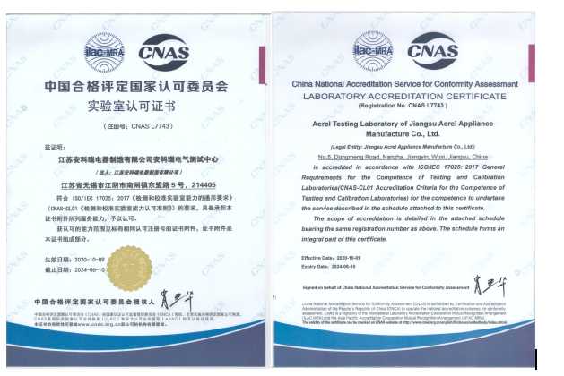 安科瑞測(cè)試中心成立于2012年,擁有電氣性能測(cè)試試驗(yàn)室、電磁兼容測(cè)試實(shí)驗(yàn)室、安全性測(cè)試試驗(yàn)室、氣候環(huán)境試驗(yàn)室、機(jī)械環(huán)境試驗(yàn)室、IP防護(hù)試驗(yàn)室、HALT/HASS試驗(yàn)室、材料試驗(yàn)室。測(cè)試中心遵循CNAS-CL01/ISO 17025《檢測(cè)和校準(zhǔn)實(shí)驗(yàn)室能力認(rèn)可準(zhǔn)則》建立了科學(xué)規(guī)范的質(zhì)量管理體系,并于2015年6月獲得了國(guó)家CNAS實(shí)驗(yàn)室認(rèn)可證書(shū)。