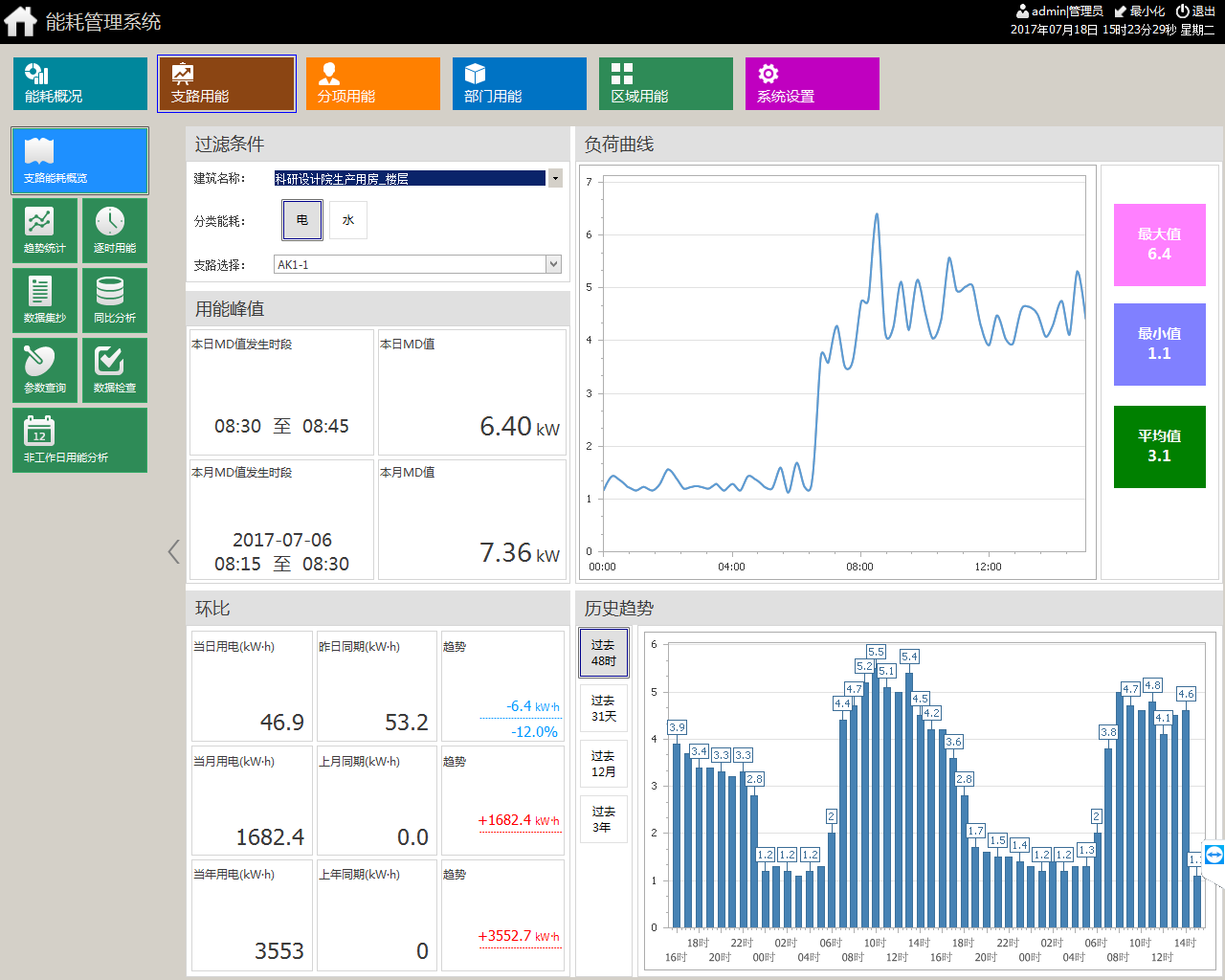 ??Acrel-5000能耗管理系統(tǒng)可以根據(jù)分類能耗的支路名稱查詢用能情況,顯示當(dāng)日和當(dāng)月的用能峰值(電能對應(yīng)需量值)、當(dāng)日用能、當(dāng)月用能、當(dāng)年用能以及昨天同期用能、上月同期用能、上年同期用能的比較情況;以柱狀圖顯示過去48小時、31天、12個月、3年的能耗情況;以曲線圖顯示15分鐘的負(fù)荷用能走勢(電表顯示功率曲線,流量表顯示流速曲線),并顯示當(dāng)前值、15分鐘內(nèi)的大、小值。