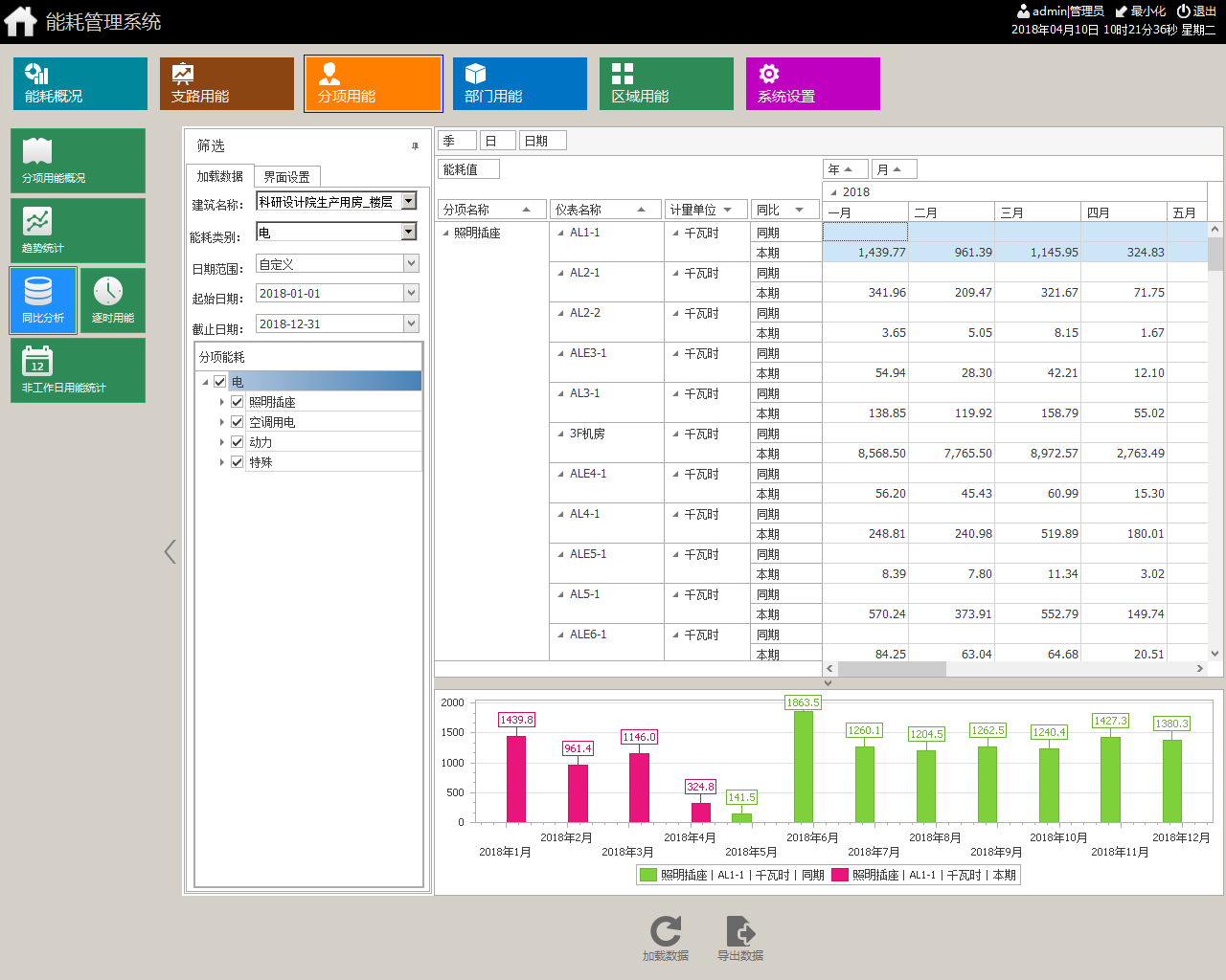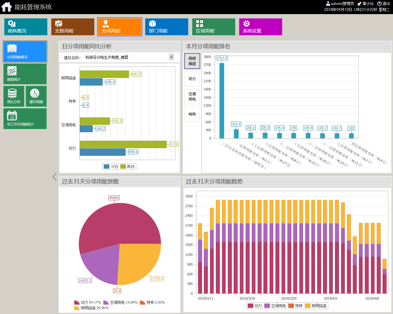 ??Acrel-5000能耗管理系統(tǒng)可以按照分項進(jìn)行能耗統(tǒng)計與顯示。其中,日分項用能同比分析圖顯示不同分項的當(dāng)日與昨日能耗柱狀圖(藍(lán)色柱表示今日,綠色柱表示昨日);用能餅圖顯示各分項過去31天的用能占比;堆積圖顯示各分項過去31天的能耗趨勢;分項用能排名圖顯示被選中分項對應(yīng)能耗值排名前10位的支路。