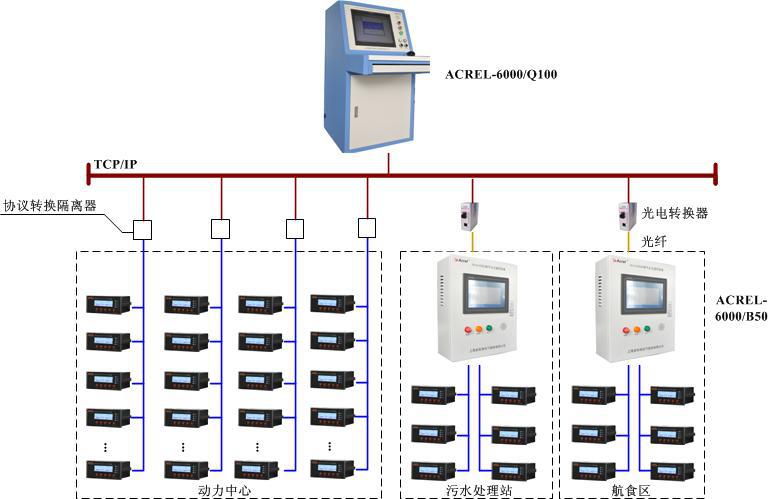 本工程共分為3個監(jiān)控區(qū)域,分別為航食區(qū)、污水處理站以及動力中心。其中航食區(qū)及污水處理站現(xiàn)場監(jiān)測回路較少,分別為24及38個監(jiān)控回路,動力中心共計96個監(jiān)控回路,本工程在配電柜現(xiàn)場均安裝ARCM200系列剩余電流監(jiān)控探測器及AKH-0.66/L型剩余電流互感器。在航食區(qū)及污水處理站管理層配置AcrelAcrel-6000/B50壁掛式電氣火災監(jiān)控系統(tǒng);在動力中心設立琴臺式電氣火災監(jiān)控系統(tǒng)Acrel-6000/Q100。三個電氣火災監(jiān)控系統(tǒng)在地理上分布于三個管理區(qū)域,每套系統(tǒng)又通過局域網(wǎng)組成一個有機的整體,將各處的漏電及溫度信息進行共享,便于機場工作人員進行統(tǒng)一管理。