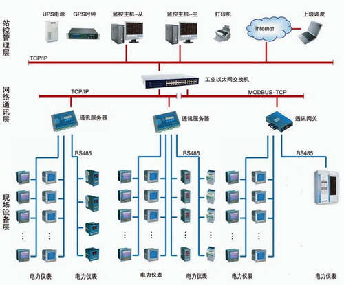 鑒于中國(guó)商業(yè)飛機(jī)總裝基地的建筑規(guī)模、性質(zhì),以及后續(xù)項(xiàng)目的可連帶發(fā)展的性質(zhì),安科瑞電氣股份有限公司系統(tǒng)部根據(jù)用戶的幾點(diǎn)需求以及在相同性質(zhì)工程中的經(jīng)驗(yàn),對(duì)該建筑的智能配電系統(tǒng)的搭建做以下設(shè)計(jì):中國(guó)商業(yè)飛機(jī)總裝基地所有變電所進(jìn)出線監(jiān)控點(diǎn)位現(xiàn)已安裝智能電力儀表,且均采用標(biāo)準(zhǔn)的Modbus-RTU協(xié)議。將現(xiàn)場(chǎng)安裝的智能儀表通過(guò)屏蔽雙絞線以手拉手式相連,其中變電所的數(shù)據(jù)總線直接鋪設(shè)至數(shù)據(jù)采集箱;樓層配電箱的數(shù)據(jù)總線鋪設(shè)至數(shù)據(jù)采集箱,再經(jīng)過(guò)光纖通訊以TCP/IP協(xié)議將該兩個(gè)區(qū)域的數(shù)據(jù)采集箱內(nèi)的能耗數(shù)據(jù)傳輸至系統(tǒng)主機(jī),系統(tǒng)示意圖如下所示: