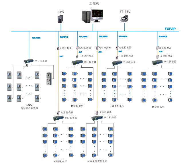監(jiān)控系統(tǒng)主要實(shí)現(xiàn)對(duì)昆山市人民南路交通樞紐城市綜合體商業(yè)中心地塊變配電進(jìn)行用電安全進(jìn)行監(jiān)控與管理。監(jiān)控范圍為10KV商業(yè)開(kāi)閉所:ACR220ELH儀表12塊,直流屏1臺(tái);10KV商業(yè)1號(hào)站:ACR220ELH儀表2塊,變壓器溫控儀2塊,PZ80L-E4/KC儀表82塊,ACR230ELH/K儀表2塊,直流屏1臺(tái);10KV商業(yè)2號(hào)站:ACR220ELH儀表2塊,變壓器溫控儀2塊,PZ80L-E4/KC儀表66塊,ACR230ELH/K儀表2塊,直流屏1臺(tái);10KV商業(yè)3號(hào)站:ACR220ELH儀表2塊,變壓器溫控儀2塊,PZ80L-E4/KC儀表84塊,ACR230ELH/K儀表2塊,直流屏1臺(tái);10KV商業(yè)4號(hào)站:變壓器溫控儀2塊,PZ80L-E4/KC儀表74塊,ACR230ELH/K儀表2塊;10KV商業(yè)制冷站:ACR220ELH儀表2塊,變壓器溫控儀2塊,PZ80L-E4/KC儀表44塊,ACR230ELH/K儀表2塊,直流屏1臺(tái)。綜合保護(hù)裝置、變壓器溫控儀、多功能儀表、直流屏通過(guò)485總線(xiàn)接入本變電所內(nèi)數(shù)據(jù)采集器,再經(jīng)過(guò)光纖、網(wǎng)線(xiàn)上傳數(shù)據(jù)至變電所值班室主機(jī),從而在監(jiān)控主機(jī)上實(shí)現(xiàn)總線(xiàn)上儀表與監(jiān)控主機(jī)的數(shù)據(jù)連通。如下圖所示:站控管理層、網(wǎng)絡(luò)通訊層和現(xiàn)場(chǎng)設(shè)備層。